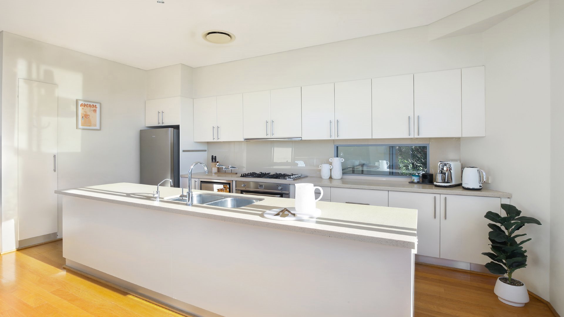 bathroom. On the middle level you will find the large kitchen that links to a light and sunny open plan living area, seamlessly flowing out to two balconies where you can soak up