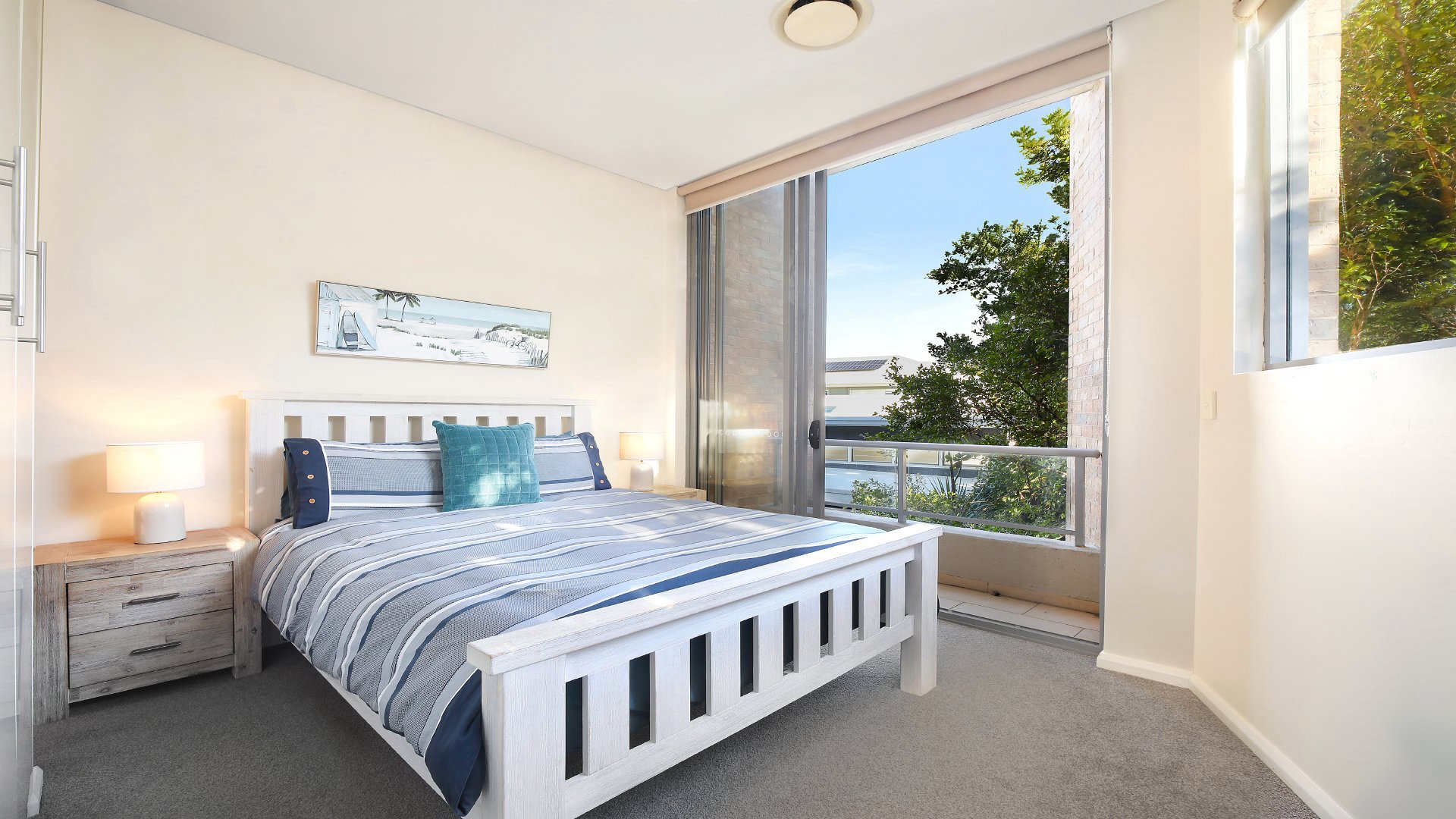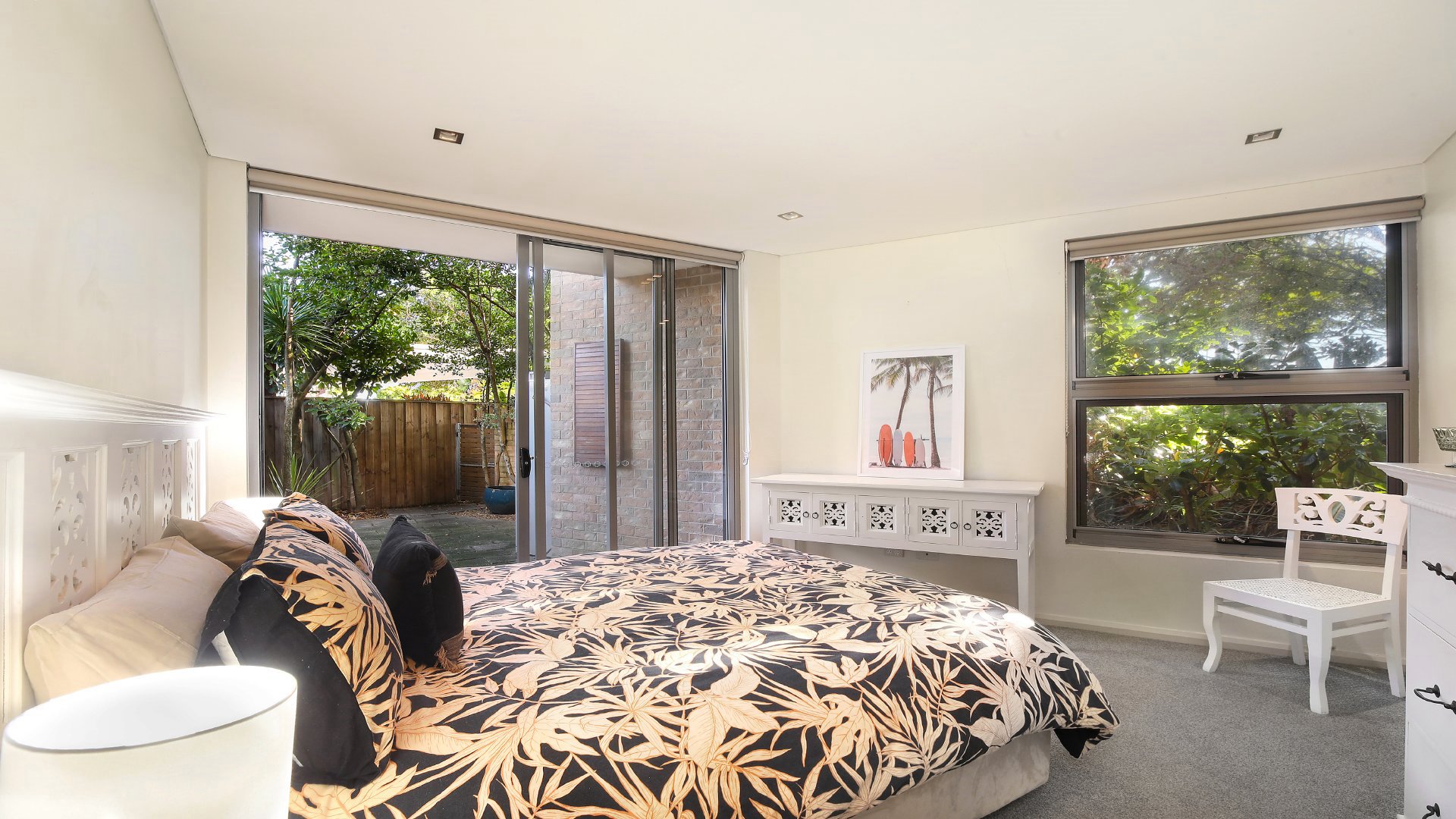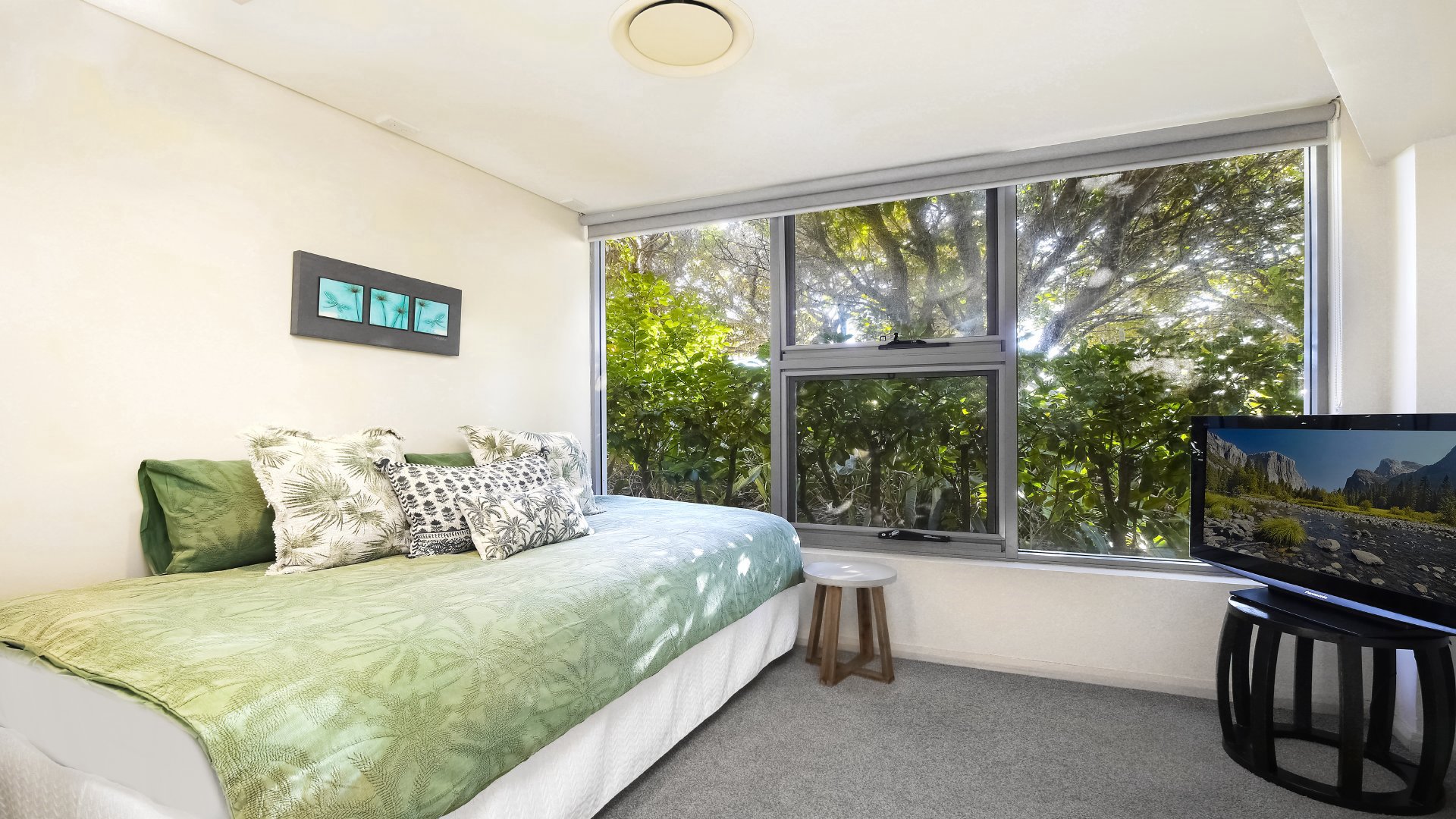 will find bedroom two with a queen bed and direct access to the courtyard, while bedroom three has a single bed with a trundle and built in wardrobe and TV, along with the main