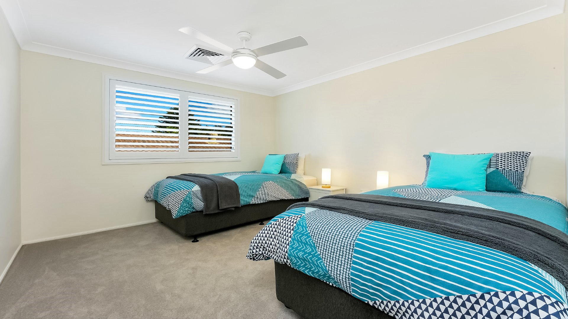 Upstairs is the spacious master bedroom with king size bed, ensuite and ceiling fan. Bedrooms two and three both have two single beds, ceiling fans and built in wardrobes.