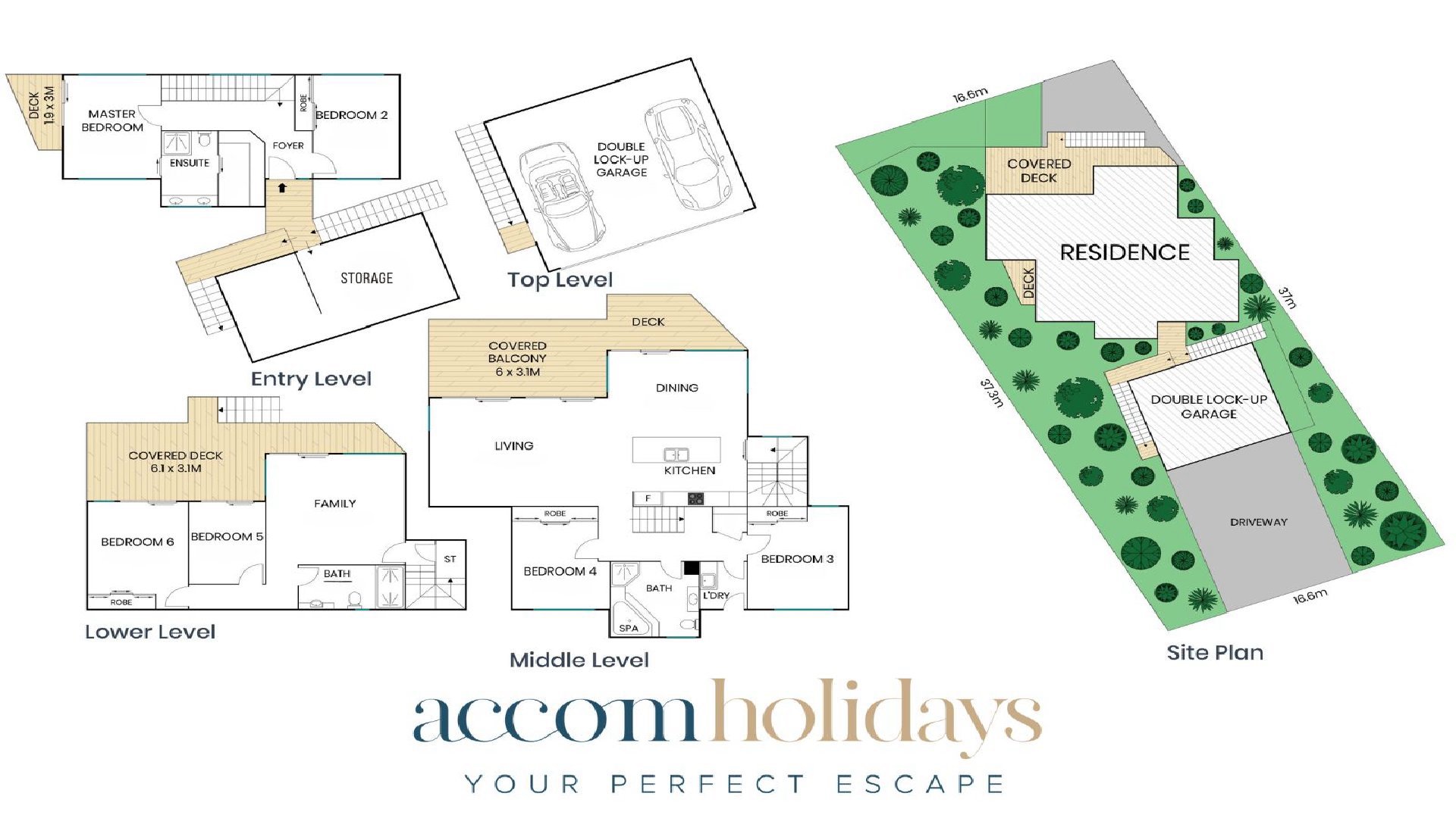 with ensuite and Juliette balcony along with bedroom two which has two king single beds. Middle level is bedroom three with a king and bedroom four with a queen along with the
